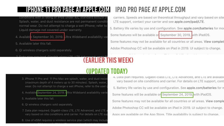 Footnote "4" leads to the bottom of the page for iPhone 11 Pro where Apple mentions "Available September 24, 2019." This also goes for Apple's new iPad software – the split to iPadOS. A review of iOS 13 from The Verge mentioned a significant number of "bugs", while MacStories mentioned "different types of glitches or slowdowns." It's likely these will be taken care of in iOS 13.1 – but we shall see!