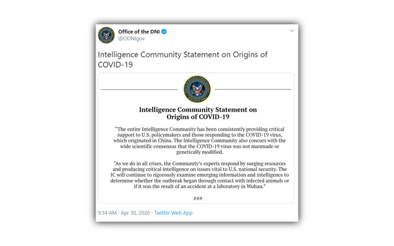 A statement was released today by the Office of the Director of National Intelligence in the USA on the origins of COVID-19. In the statement it's written, "The entire Intelligence Community has been consistently providing critical support to U.S. policymakers and those responding to the COVID-19 virus, which originated in China." They go on to agree with "wide scientific consensus that the COVID-19 virus was not manmade or genetically modified."