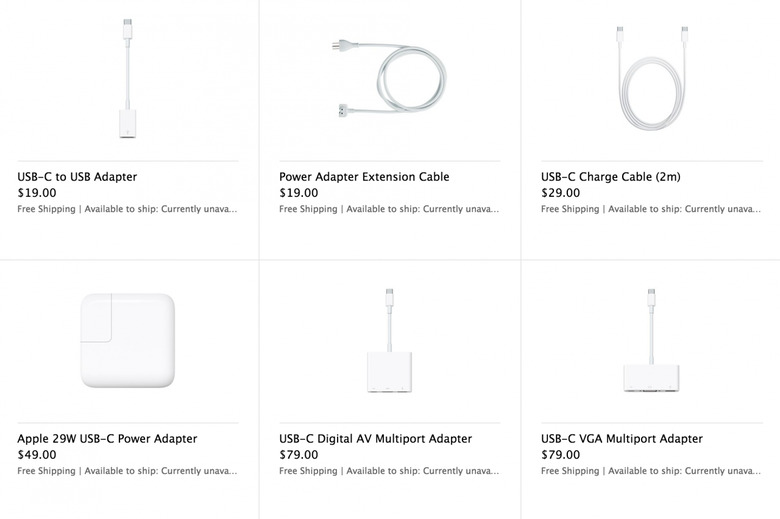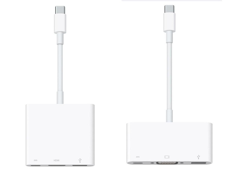 A $79 USB-C Digital AV Multiport Adapter will bring you connectivity to a single USB 3.1 Gen 1, USB-C, and full-sized HDMI (out). This cord is below on the left.