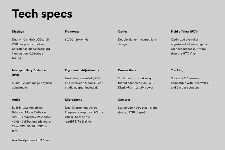 Valve has set up an in-depth page for the Index on its website in which it lists the specifications for the headset. You can see full specifications in the image below, but obviously, the display specs immediately jump out. Valve says that the Index uses dual 1440 x 1600 LCDs, just like the VIVE Pro does. The difference between the Index and other VR headsets, Valve claims, is in its "optimized pixel layout," which serves up 50% more subpixels than OLED.