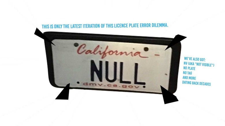 A user by the name of "Droogie" (Joseph Tartaro) decided he'd be clever and register a custom license plate with the word NULL. That means blank, empty, the end – it's not a word you hear people use all that often other than to say "null and void" – which, incidentally, was part of Tartaro's plan. He'd intended on getting 2 custom plates, one for himself, the other for his wife, one that said NULL, the other VOID.