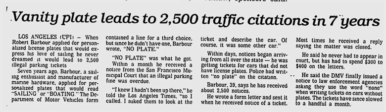 In the year 1979, one Robert Barbour of Los Angeles applied for a vanity license plate for his vehicle, and was given a sort of instant-rundown set of three lines for potential plates. His first choice was SAILING, then BOATING. If he couldn't get one of those, he would just get a standard plate, so on the third potential plate name line, he wrote "NO PLATE." You can probably guess what happened next.