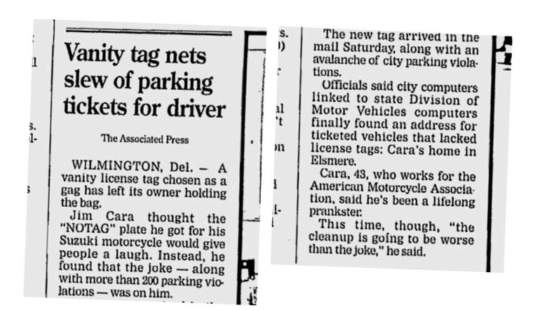 An Associated Press article published in the Southeast Missourian back on July 25, 2004 spoke of a man named Jim Cara. This man lived in Wilmington, Delaware, and thought the license "NOTAG" would be a hoot. They suggested that "the new tag arrived in the mail Saturday, along with an avalanche of city parking violations."