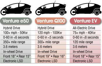 VentureOne takes the Carver concept and commercialises it, bolting in that current environmentalist's fetish the Hybrid Drive and boasting over 100mpg despite 100+mph speeds and 0-60 in 6 seconds or less. They've obviously changed the body style too, going for more of a futuristic recumbent bike style (or Tron Bike as my friends over at electro^plankton would have it). Best news, however, is the target price when it comes to market in 2008: $18,000 for the base model, rising to $23,000 for an all-electric variant.