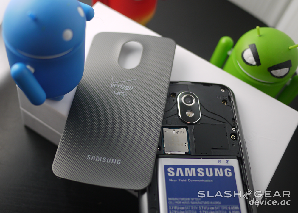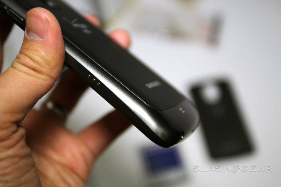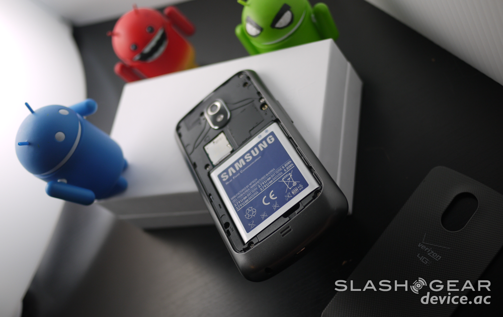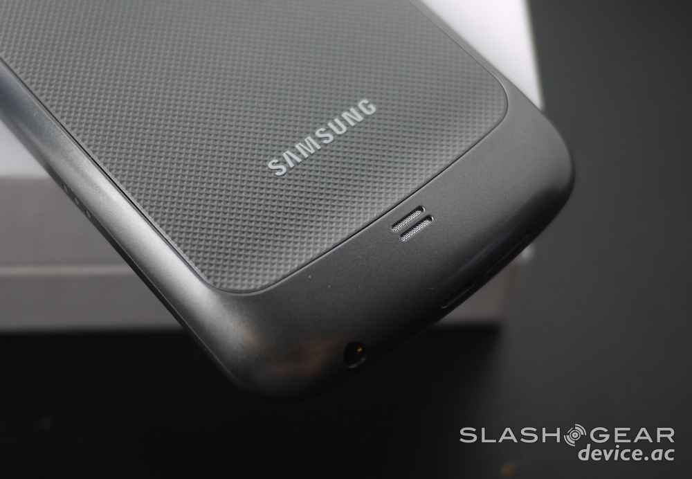 The outer rim of this device is a hard plastic not unlike what you'll find in most Galaxy S II units in stores today, with a battery cover that's an interesting piece of flexible textured plastic. You've got one microphone at the top right of your battery cover (a tiny hole), and another at the bottom of the device on the right. The bottom of the device also houses the microUSB port and headphone jack, while the back bottom is the location of the main external speaker for speakerphone, games, videos, music and etcetera. The battery cover you'll find has SAMSUNG near the bottom and Verizon 4G LTE near the bottom, right below the capsule-looking camera setup which includes a higher quality than average 5-megapixel camera and a single LED flash below it.