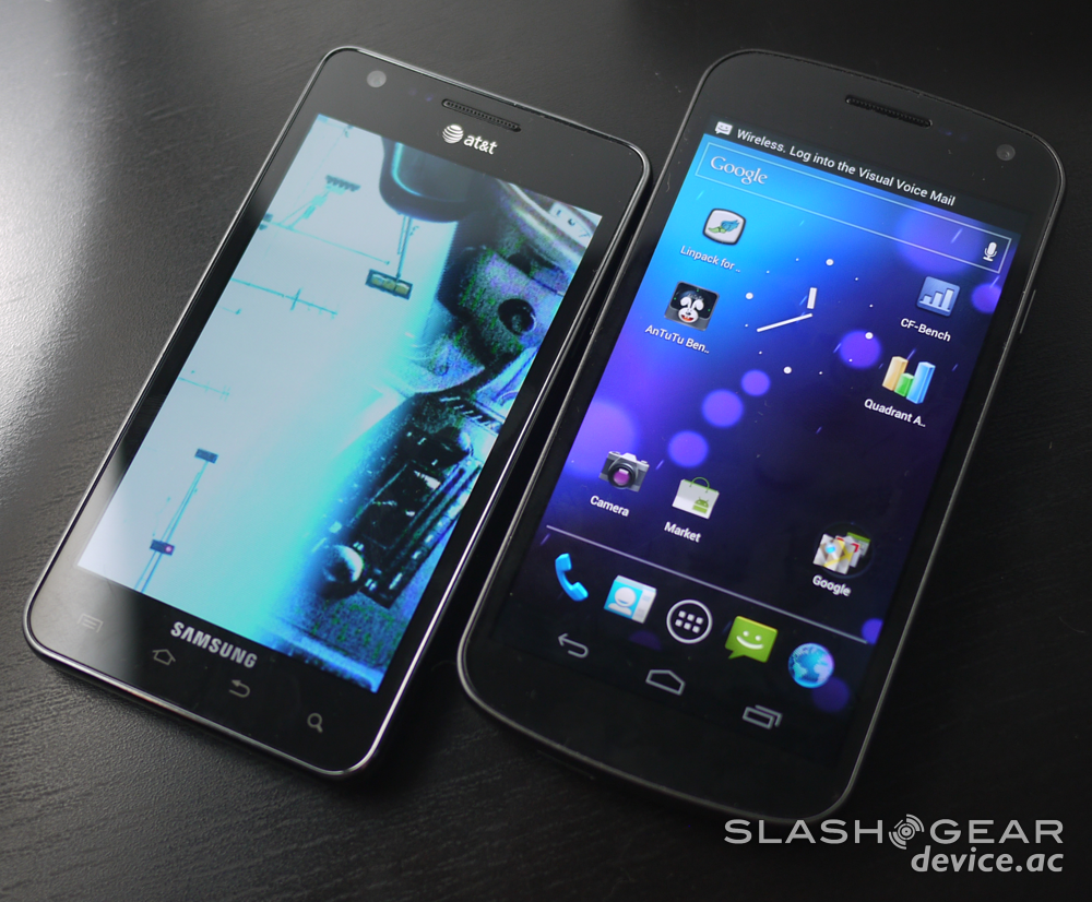 Compared to the Galaxy S II, the obvious improvements can be seen instantly: there's a bit more curve in the design for those of you who found the Galaxy S II to be a bit flat, the display is one step up in resolution over the Galaxy S II (original and AT&T versions, that is,) and there's a notification LED on the front face! The software differences are essentially like night and day inside the Android world, but not all THAT different when considering the rest of the non-Android software choices out there. The Verizon Galaxy Nexus is also notably heavier than the Galaxy S II (again, original and AT&T versions we're talking about here,) but much lighter than the rest of the LTE-laden devices on Verizon.
