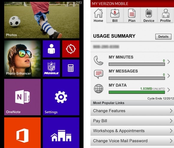 Verizon's version of the Windows Phone 8X has a little bit of the carrier's own offerings squished inside the rest of the WP8 user interface. Thankfully, Verizon doesn't go too crazy with the carrier-specific apps. There's VZ Navigator, NFL Mobile, and My Verizon Mobile, which lets you manage your Verizon account and check to see how many minutes you've used up, as well as how much data you have left during the billing period. None of Verizon's bloatware — if you could even call it that — gets in the way at all, and I actually hardly even noticed that the apps were there.