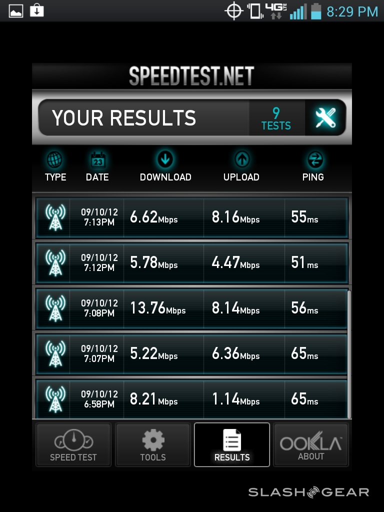 If you're a person who uses their device every 10 minutes, you may have to charge the device once halfway through the day. If you're a regular person who works with their smartphone every half-hour or so, you'll probably be good to go for your whole workday. This device uses a 2080 mAh non-removable battery, by the way, just a bit bigger than the Motorola DROID RAZR M (which has a 2000 mAh, massive for a device of its size.) This device, once again, runs on Verizon's 4G LTE network which you can see rocking quite well in the speed tests included here: