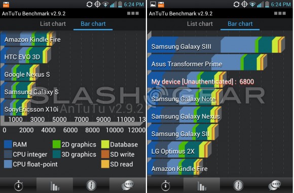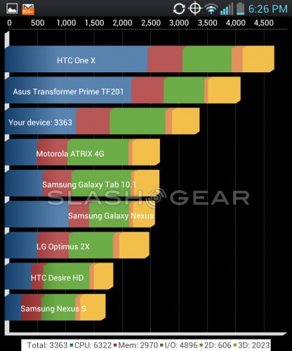 This device has 1GB of RAM inside alongside a dual-core Snapdragon S3 processor clocked at 1.5GHz. That's basically the same as what we saw in the tiny LG Lucid back in March of this year. LG informs us that the S3 should be perfectly capable of bringing on awesome "multitasking muscle" even if it's not the newest architecture on the block – and for the most part we've seen that to be true in everyday use. Have a peek at a few benchmark tests here to see how it adds up: