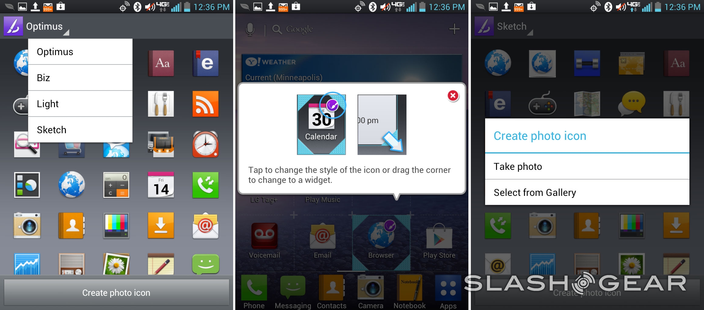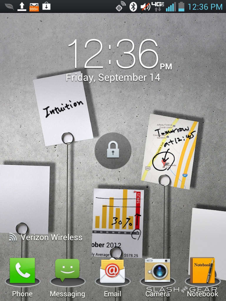 Inside of this device you'll find LG's newest user interface working with Android 4.0 Ice Cream Sandwich. You've got the regular awesome abilities of ICS such as a Recent Apps button – included in an odd set for this device in the physical row – notice how there's a menu button in there too, this being a unique set for any Android device thus far released to the market. The lockscreen here allows you to do a simple unlock by swiping across any part of the screen, or you can swipe through any one of five app shortcuts to go there too – pull down your notifications work on the lockscreen as well.