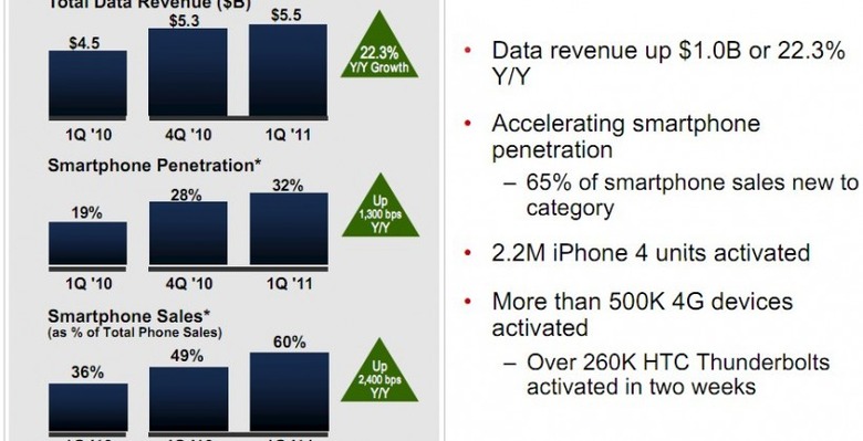 Smartphone sales accounted for 60-percent of total phone sales, up from 49-percent in Q4 2010, to make up 32-percent of all Verizon's postpaid users.