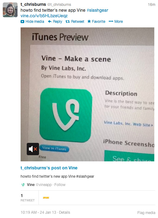 It's time to get real with Vine, Twitter's newest and perhaps most bold introduction of a service since their inception as a mobile-friendly service. Here with Vine you're invited to create 6-second videos that you construct instantly of one single shot or a series of shots by pressing the center of your smart device's display. The results are posted to Twitter (and Facebook, if you like) as well as on Vine's own server, these videos then able to be viewed near-instantly by your connected associates.