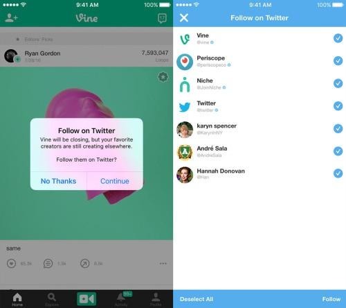 However, they won't automatically be transitioned over: you can't have all your Vine followers auto-follow you on Twitter. The dialog box Vine is showing offers a list of all the current Vine creators a user follows and checkboxes to continue that over on Twitter. Vine says the feature will be launched closer to shut-down.