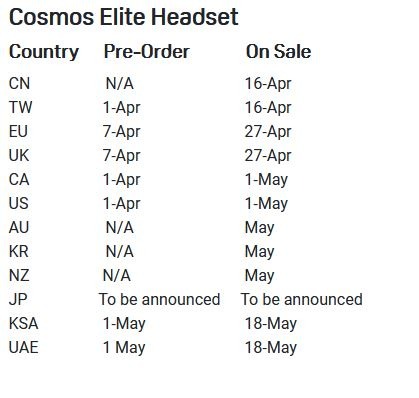 You can see pre-order and on-sale dates for multiple regions around the world in the image above. Given the current health crisis, it may not be a bad idea for prospective buyers to order one of these headsets ahead of time, because we could easily see some shortages of the Vive Cosmos Elite similar to what we saw with the Valve Index if demand is high enough.