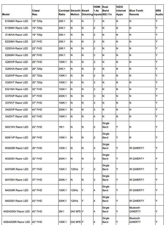 IRVINE, Calif., Jan. 4, 2011 /PRNewswire/ — VIZIO, America's #1 LCD HDTV Company*, announces over 40 new LED LCD HDTVs, from a convenient 16-inch class size to a larger-than-life 71-inch class size and two new Cinema HDTV™ LED lit models that supports 21:9 Cinema aspect ratio with Theater 3D and VIZIO Internet Apps™. The new models span across all three of VIZIO's HDTV product lines, from the essential E series, to the sleek design of the M series, and to the award winning, high performance XVT series.