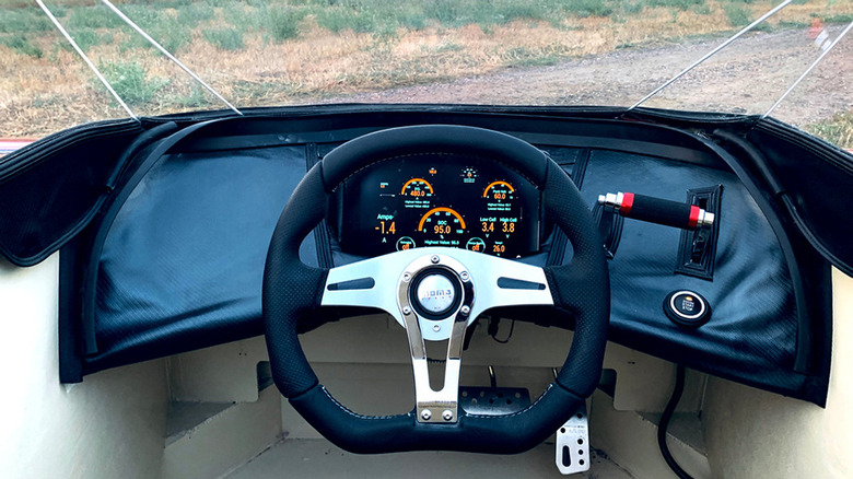 The Von Mercier Arosa has an open cockpit with a tandem seating arrangement like a jet fighter or the Suzuki Misano concept. You don't get air-conditioning, but the driver gets a Momo steering wheel, pedals, and a digital dashboard. It also has side decks like a boat so that you can bring more people for a ride in your sport-luxury hovercraft.