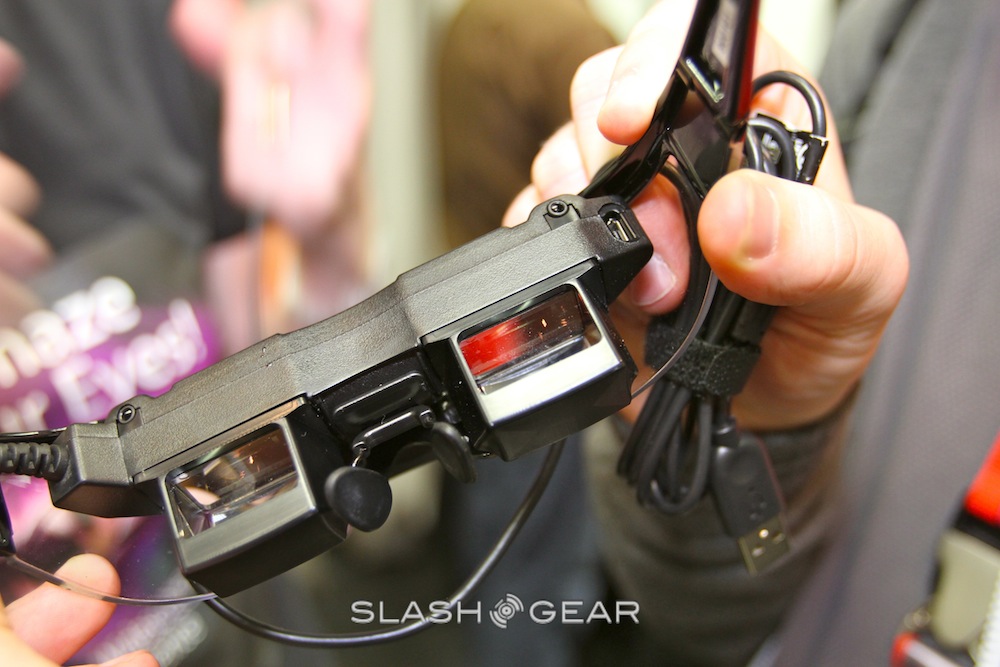 Just like other Vuzix headsets, you can individually adjust each eyepiece to suit various levels of eyesight (or wear them over glasses, though it's a clunky and heavy option and we felt like it might slide off at any moment) as well as adjust the nosepiece and tilt the eyepiece section inside the glasses frame. Audio output is supported too, while inputs include composite and component for hooking up to a PMP or DVI and VGA for your computer. USB is used for the AR software, and Vuzix says most apps – as long as they have the right connections – should work with the STAR.