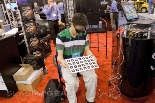 In their demonstration, Vuzix had the 920AR hooked up (via USB 2.0) to a laptop, and handed us a board of AR glyphs which the software could identify, track and overlay with different graphics. Those graphics moved around in sync with head movements. Of course, the practical applications are pretty much up to the PC and Mac developers to whom Vuzix are hoping to bring on board; the obvious use is gaming, and we saw two similar systems – from the University of Singapore and Scope – last month.