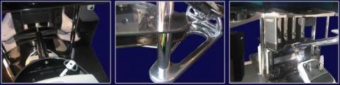 Built around a custom aluminium and chrome frame with tinted shelving, the genuine Sparco Monza racing seat puts you in front of those three LC-D62U high-def displays and a 7-inch Power Acoustik rear-view "mirror" display. Microsoft's own force-feedback wheel and pedals take care of control, and a Harmon Kardon AVR-144 surround sound receiver handles 1900 watts of sound. Meanwhile, a 1500 watt vibration feedback unit does the business on your buttocks.