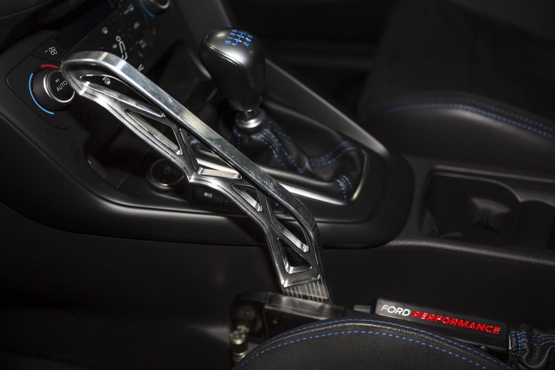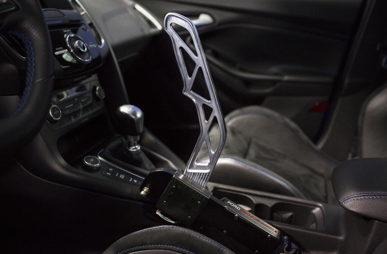 The stick itself is made of solid aluminum, and fits between the driver and the manual gearshift. It plugs into the car's systems via the existing diagnostics port, and there's no welding, hold drilling, or any other permanent modifications to either the cabin or the brake system. Ford says it can be triggered with just five or six pounds of pressure, which is far less than a hydraulic handbrake would demand.