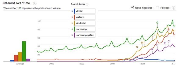 It would appear that the Samsung brand push of the name "Galaxy" associated with their Android-toting smartphones and tablets is working so extremely well that this week the hardware name has become more popular than the software. Having a peek at the findings analyst Benedict Evans has found with a few search term trends in Google's own search engine, it's made clear that as the Android search term has risen, so has the term Galaxy. In November of 2012 it's shown that Galaxy was searched more than Android for the first time either term was relevant in search terms across Google's history.