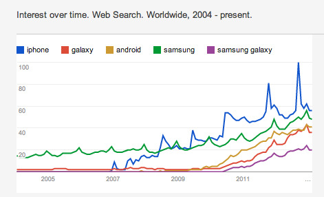 It's important to note that the term "galaxy" does benefit in some way from the fact that it's a non-brand word as well as a brand, but so too is the word "android." It's also clear that the term "galaxy" has risen along essentially the same path as "Samsung Galaxy" and right along with "android", making non-brand searches essentially irrelevant. The eclipse (however small it may be) shows that Samsung is making a massive impact on the way people see the smartphone universe.