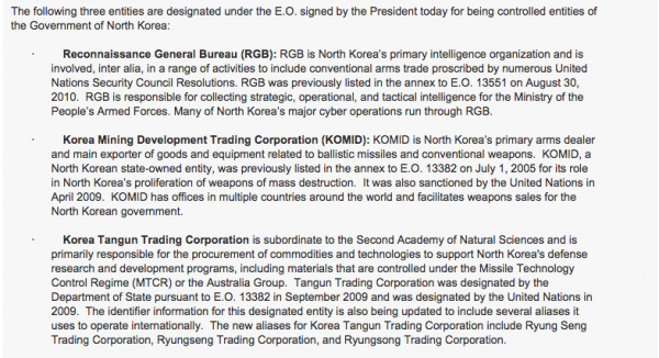These sanctions single out business dealings with North Korea, a government intelligence agency, and an arms dealer. The Reconnaissance General Bureau is North Korea's primary intelligence organization, while Korean Mining Development Trading Corporation (KOMID) is the arms dealer in question.