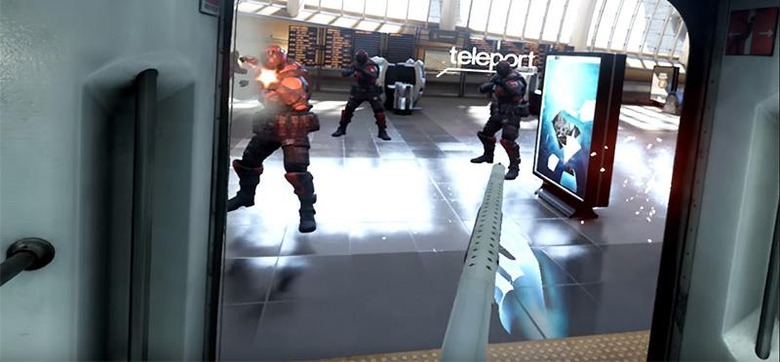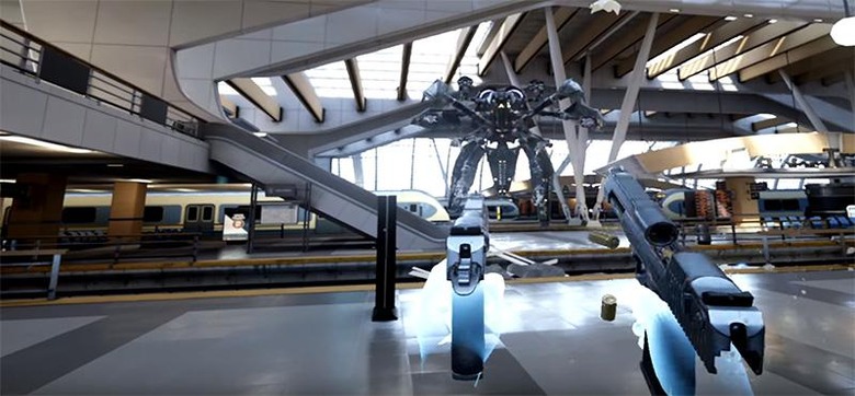 I was still waving my hands in front of my face when she loaded up the game. I found myself standing on a train, and my hands were still right there with me. I learned that I could teleport in the game, which was neat. But then I was instructed to pick up a gun, and that was when I had the closest thing to a religious experience that I've ever had in a game. I picked up the gun, and aimed down the sights, and it felt real. I felt like I was in the game, holding a gun, and shooting it. Once the doors opened, I started shooting things, and it was amazing. It did take a little bit to get the controls down, but aiming the gun and firing were the most natural things to do. I even found myself closing one eye, to get a better aim (which worked, by the way).