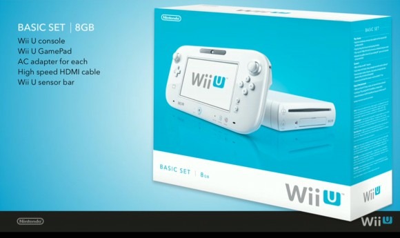 In the Basic set will be the console and GamePad tablet themselves, together with an AC adapter for each, an HDMI cable, and a Wii U sensor bar. The Premium set will get the same, plus 32GB of storage, stands for the console and the GamePad, and a GamePad charging cradle.