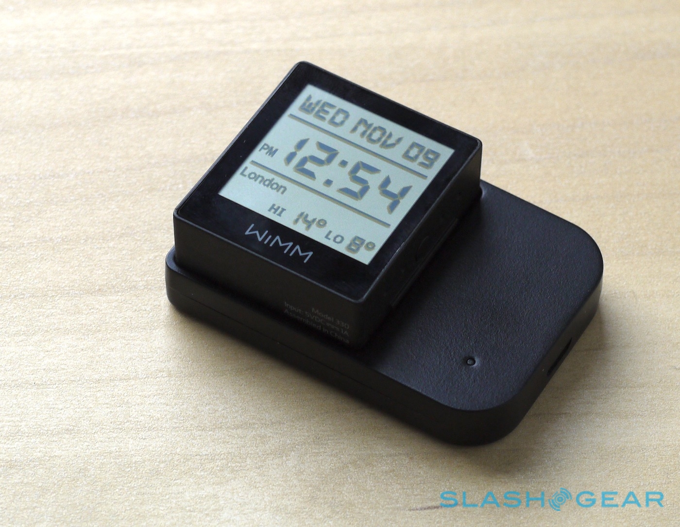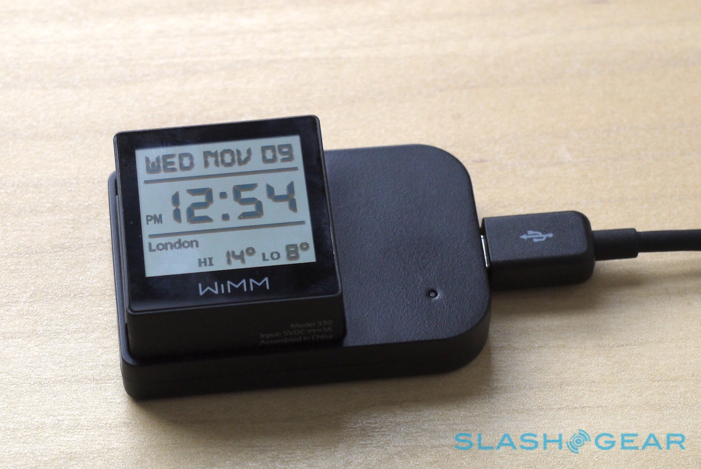Inside, there's a 667MHz processor paired with WiFi, Bluetooth, an accelerometer and digital compass, speaker and a vibration alert. The case itself is splashproof, and has only one physical control: a recessed power button on the right side. On the back, there's an 18-pin proprietary connector, which matches up to a microUSB sled that the WIMM One magnetically latches to for recharging and synching with a computer (where it mounts as an external drive, showing 2GB of onboard storage). We did find the watch could shift around on the charger base and lose contact if we weren't careful with how we placed it, though there's an LED to show when it's actually charging.