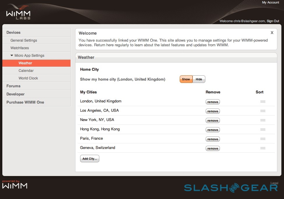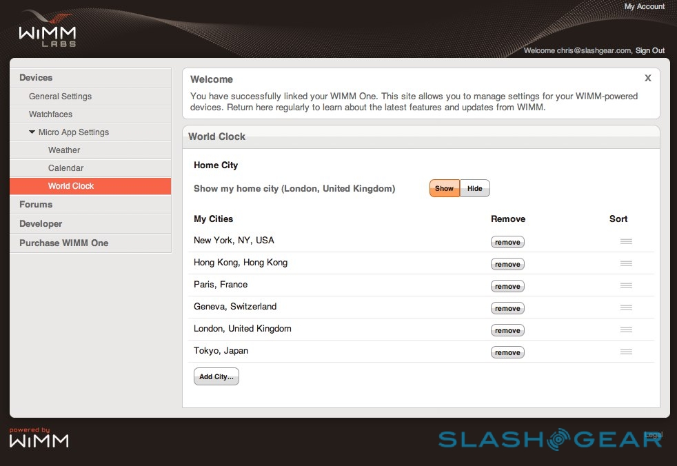 From there it's a matter of setting time and date, choosing your home city and setting up sync frequency. Further tabs take you into a selection of different watch faces, which can be hidden and reordered, as well as settings for the Micro Apps. Again, these apps can be shuffled around in the order they show on the app carousel, or hidden altogether if you don't find yourself using them. Some have further settings, such as choosing cities in the Weather and World Clock apps, or registering your Google Calendar or Exchange Calendar to be shown in the WIMM One's Calendar app.