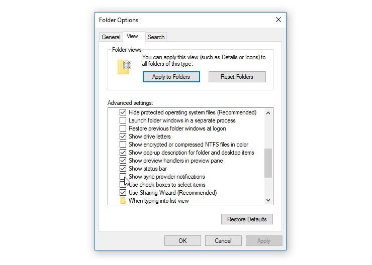 2. At the Folder Options, go to View tab > uncheck the "Show sync provider notifications" > click Ok to close the Folder Options