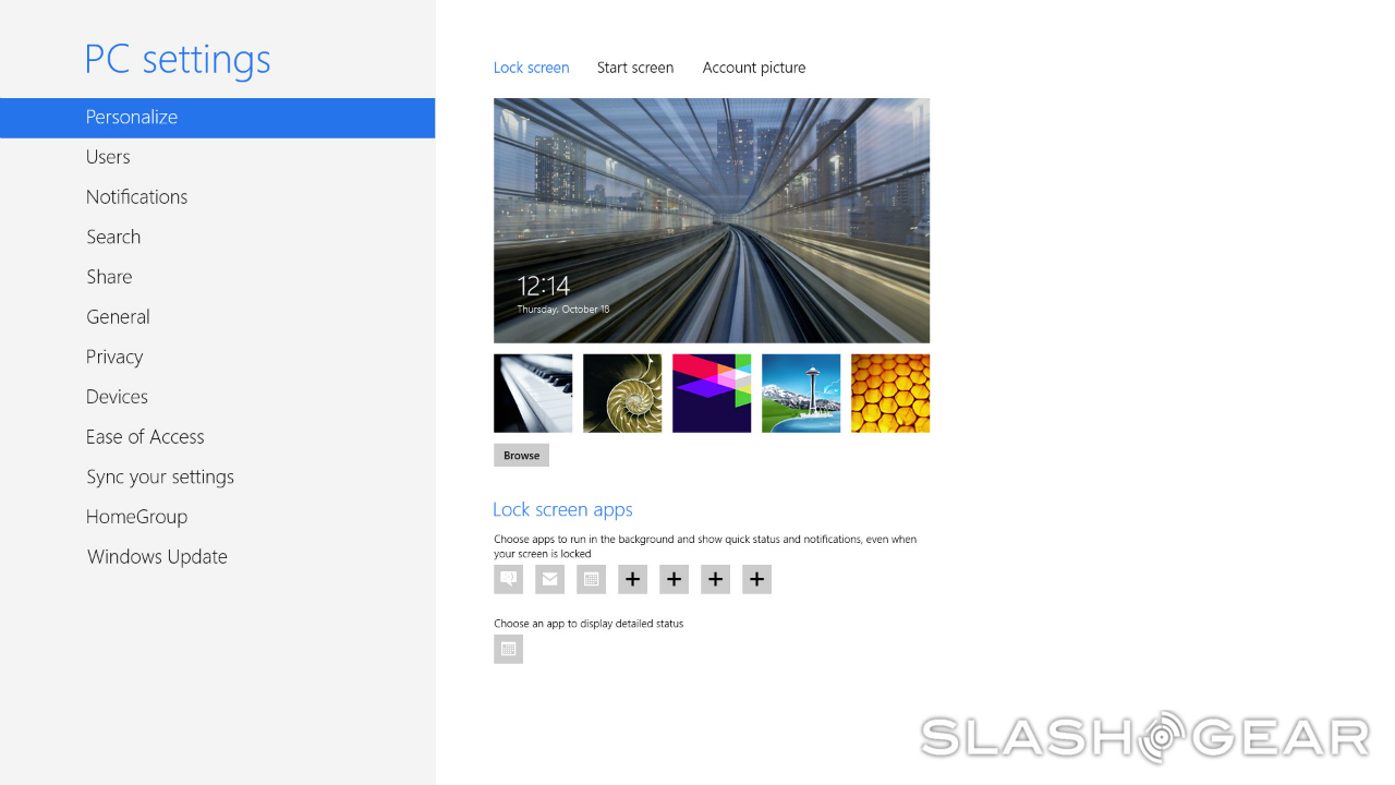 There's also a lock screen present in Windows 8, which again is something that makes sense for touchscreens but seems a little out of place on desktop PCs. The lock screen is the first thing you'll see when you boot up your computer, and through the PC Settings submenu you can assign a new background image and designate a handful of apps that will display information. It's a fancy touch, but as I said, its use seems somewhat limited if you're using Windows 8 on a desktop.