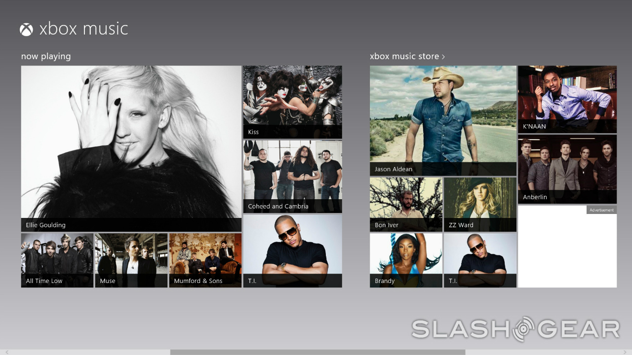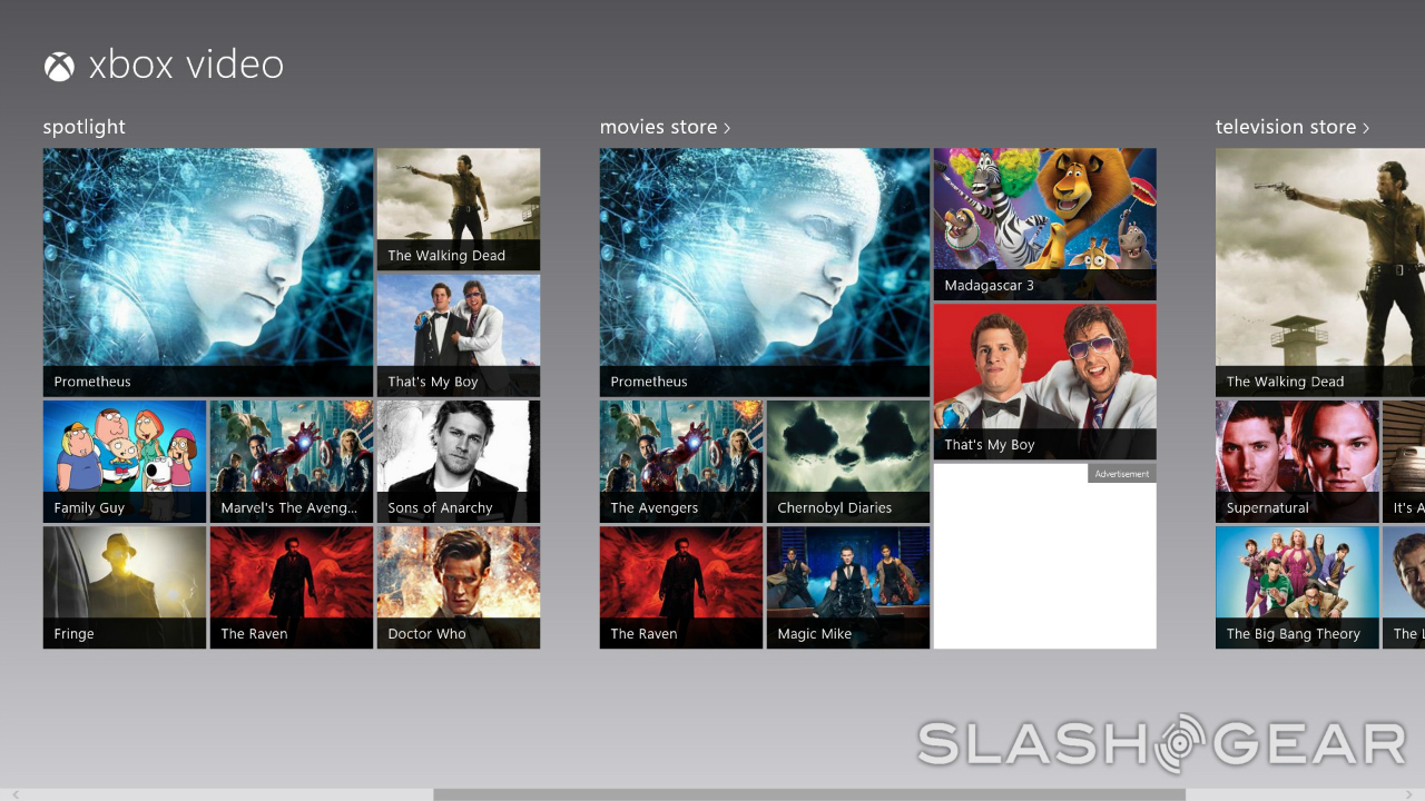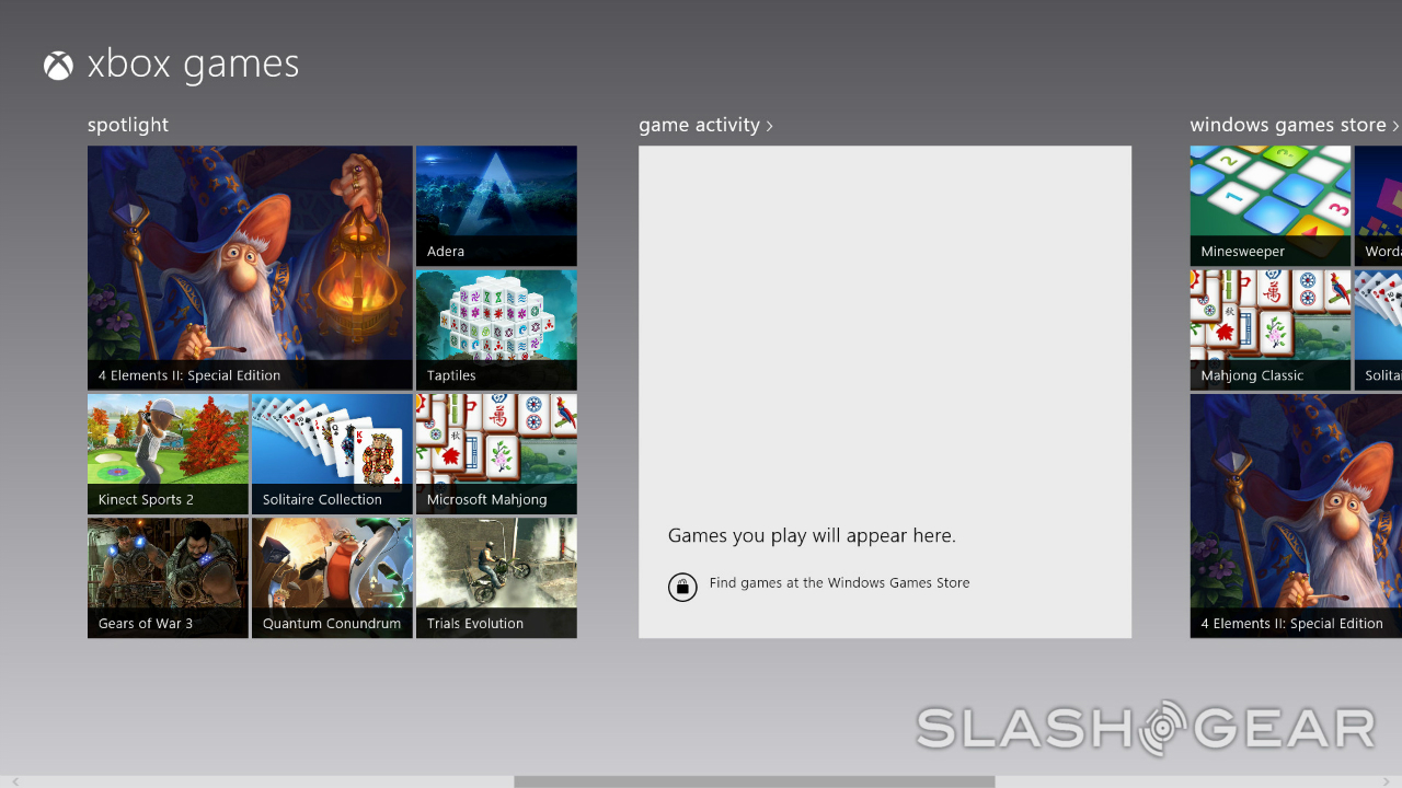 Next we come to SkyDrive, Music, Movies, and Games. SkyDrive is Microsoft's own cloud solution, but it's really like any other cloud app out there – choose files to upload to the cloud, and then you can access them from anywhere after you've signed into SkyDrive. Xbox Music, Xbox Movies, and Xbox Games are essentially just stores where you can buy movies, television shows, music, and games but they also display the relevant files you have stored on your computer right there in the app. I have to say, it's nice to see these three get their own apps, since that means that you won't have to trudge through a bunch of other app listings just to find the entertainment offerings.
