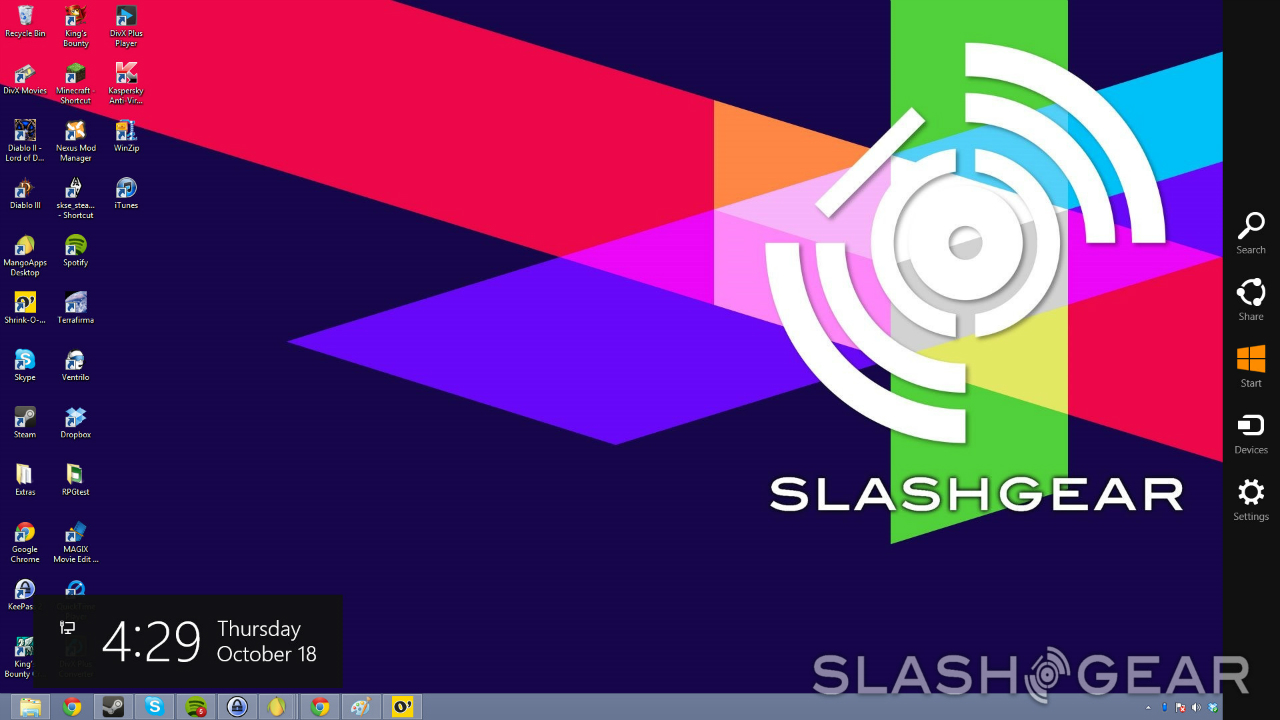 While the Start screen is definitely one of the biggest changes to be found in Windows 8, it's only one part of a larger User Interface overhaul. Move your cursor to the upper right-hand corner of the screen, and you'll be presented with a menu bar that pops in. By doing this, the time and date will also appear in the lower left-hand corner of the screen, which make it easy to check the time while you're on the Start screen, but proves rather unnecessary when you're on the desktop – the time and date are already displayed in the lower right-hand corner of the desktop, after all, right next to the system tray.