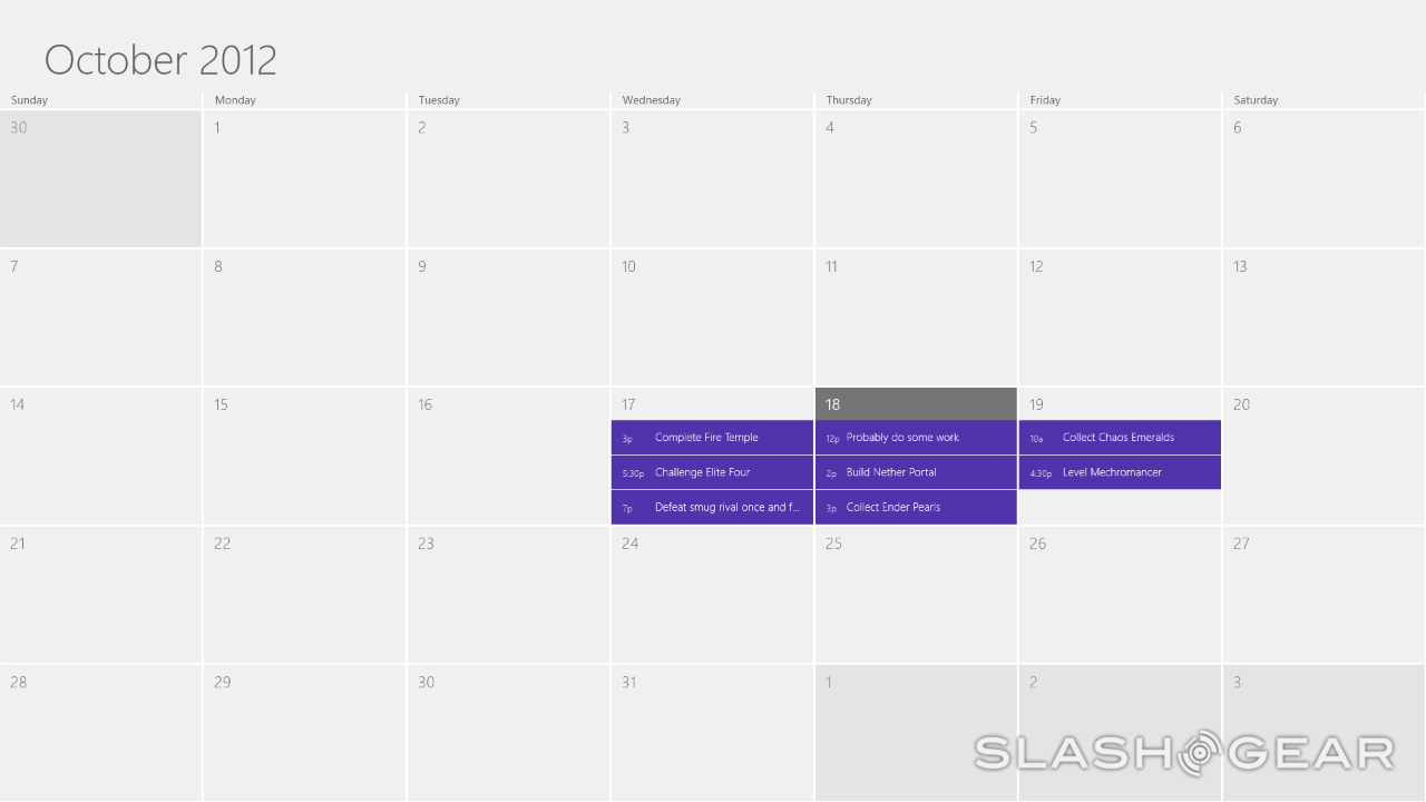 The same seamless integration mentality applies to Calendar. Upon opening it for the first time, I was greeted with my Google Calendar, and edits I made in my Google account immediately showed up in my Calendar app. That kind of integration can't be understated – it's really, really nice to have Microsoft implement something like this. It means that the amount of setup that falls on the shoulders of users is next to nothing, which will definitely be appreciated, particularly by those who feel a little overwhelmed when seeing all of the changes Microsoft has made in Windows 8.