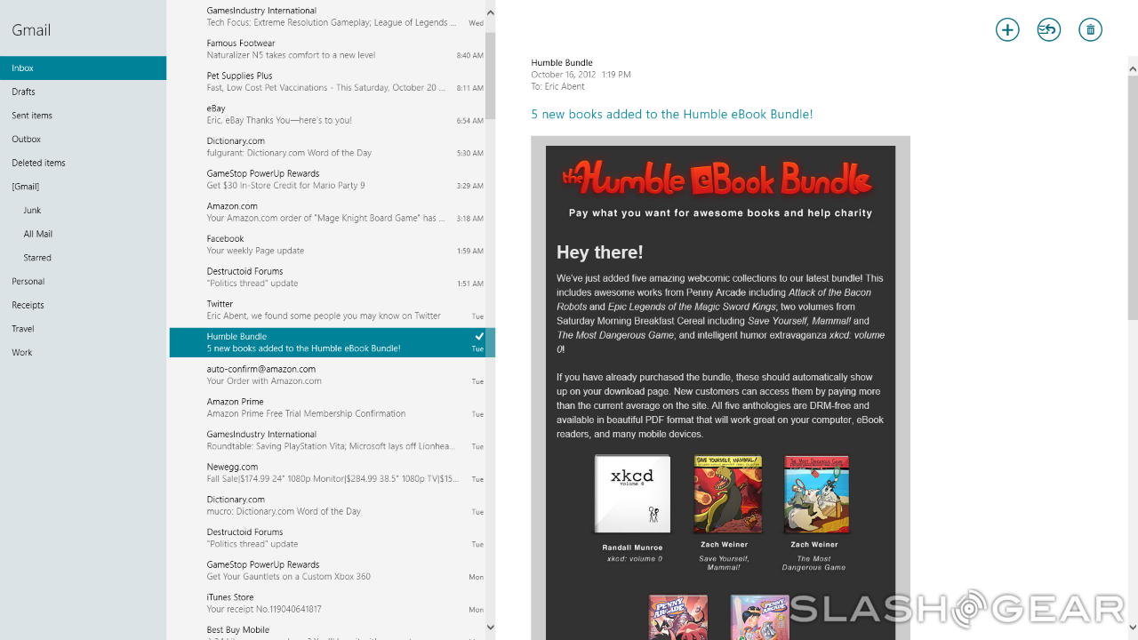 The usual suspects are all present and accounted for, including Mail, Calendar, and Messaging. Since I signed up for my Microsoft account with my Gmail address, my Gmail inbox was there the very first time I opened the Mail app, but you can add other accounts easily. The Mail app gave me all of the functionality of my Gmail account, which means that by accessing the Mail app, I save an extra step or two by cutting out the need to open up a browser and sign into my Google account.