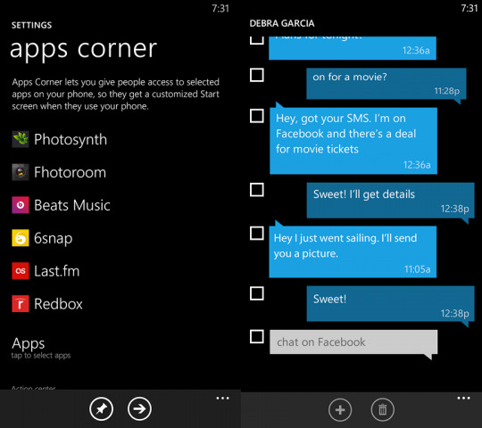 There are other new features that have also been revealed. Apps Corner is something managers and employers might love, as it allows them to set a limited list of apps that users can have access to, like a sort of protected Start screen. They can even set the device to boot directly into an app or export an Apps Corner profile to be used in other smartphones. Avid texters, on the other hand might appreciate that now they can select multiple messages to merge, delete, and even forward them all at once. Xbox Music makes a trip to the future as well as the past, not only gaining better performance but also getting back features that it lost. like background syncing and swipe to advance.