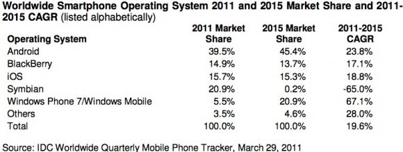 Parallel to that, the expectation is that Symbian market share will dwindle considerably, falling from an expected 20.9-percent in 2011 to just 0.2-percent in 2015. RIM and Apple are both forecast to lose market share, with BlackBerry OS dropping from 14.9-percent to 13.7-percent, and iOS from 15.7-percent to 15.3-percent.