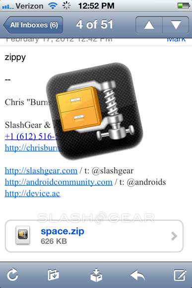 It's time to make the opening of ZIP files easy, finally, on the the iOS platform for iPhone, iPad, and iPod Touch. This application takes files that have been compressed with the .ZIP file extension and opens them up for you – but more than that, it's able to show you what's inside without you having to run the files in other applications. In the example we've got here, a simple image is sent in a .ZIP file through email, opened in the basic Mail app, and the image is previewed inside WinZip.