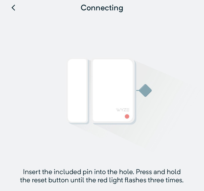 Contact sensors are added to the system by pressing a small pin key (it is essentially a sim lock tray remover) into a small hole on the sensor. The pin presses a button in the contact sensor, prompting it to blink three times. After the blinking ends, the pin can be removed and the app will add the sensor to the existing system.
