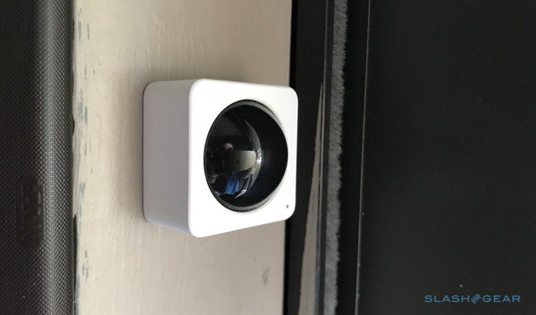 The final component is this kit is the motion sensor, which is a small square-shaped device with a dark, rounded, protruding lens. The device's function is obvious: the piece monitors the nearby area and issues alerts to the camera and mobile app when movement is detected. As part of this process, the camera starts recording when motion is detected.