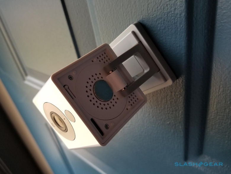Pushing the base up against the bottom of the camera causes it to fully fold into the camera, leaving you with a simple palm-sized cube. The base has magnets embedded in it and can be attached directly to a metal surface like a stove hood, refrigerator, metal door, or certain windowsills. The included metal pancake and adhesive backing makes it possible to attach the camera to any surface, however.