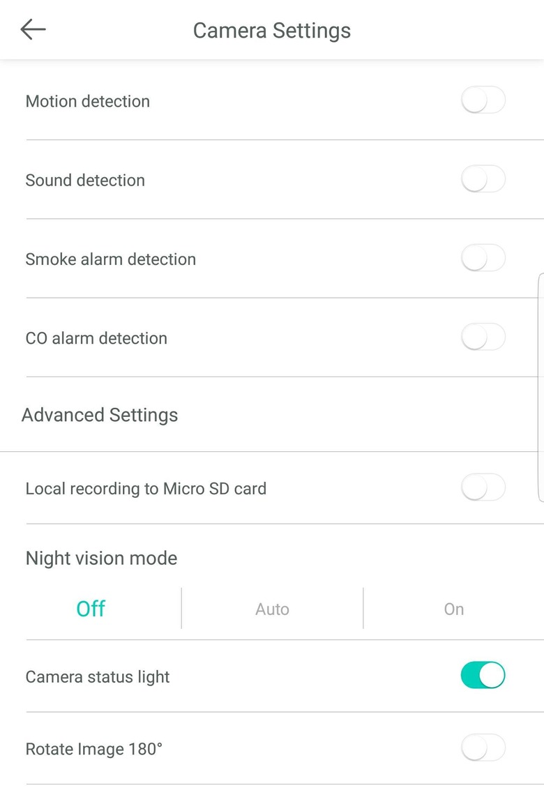 In addition to the basic controls, users have access to the Night Vision function; you can set it to Auto or manually toggle the IR lights on and off. There's also a small video resolution button for toggling between high definition and standard definition. From there, users can set up (or leave disabled) some more sophisticated features, such as CO and smoke alarm detection, sound and motion detection, enabling microSD card recording, turning on/off the status light, and rotating the video 180-degrees.