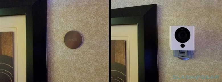 The Wyze camera is sold in a small, dense rectangular box. Open the box and you'll find two smaller cubes: one cube is the camera and the other contains its long USB charging cable. Joining both is a round metal pancake and a 3M adhesive backing. It's all very simple. The camera's hinged and magnetic base is already attached to the bottom of the camera, but you don't have to use it.