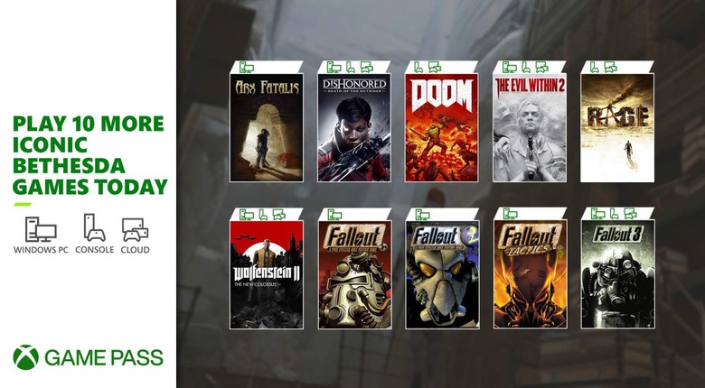 Today alone, in fact, there are 10 more Bethesda games joining the service. That includes Yakuza: Like a Dragon (Cloud, Console, and PC), Arx Fatalis (PC), Dishonored: Death of the Outsider (PC, Cloud, and Console), Doom (Cloud and Console), Fallout (PC), Fallout 2 (PC), Fallout 3 (PC, Cloud, and Console), Fallout: New Vegas (Newly added for PC, Cloud, and Console), Fallout: Tactics (PC), Rage (Cloud and Console), The Evil Within 2 (PC, Cloud, and Console), and Wolfenstein II: The New Colossus (PC, Cloud, and Console).