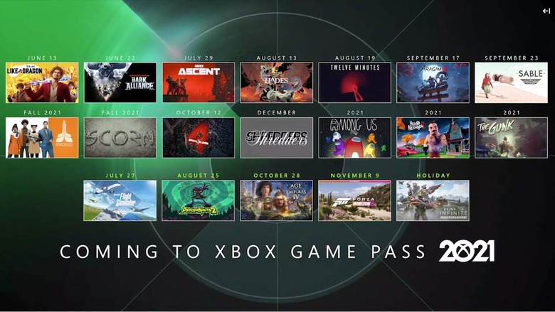 The Ascent (PC, Cloud, and Console) – July 29Twelve Minutes (PC, Cloud, and Console) – August 19Psychonauts 2 (PC, Cloud, and Console) – August 25Aragami 2 (PC, Cloud, and Console)) – September 17Sable (PC, Cloud, and Console) – September 23Scorn (PC, Cloud, and Series X|S) – Fall 2021The Anacrusis (PC, Cloud, and Console) – Fall 2021Back 4 Blood (PC, Cloud, and Console) – October 12Age of Empires IV (PC) – October 28Forza Horizon 5 (PC, Cloud, and Console) – November 9Shredders (PC, Cloud, and Console) – December 2021Halo Infinite (PC, Cloud, and Console) – Holiday 2021Hello Neighbor 2 (PC, Cloud, and Console) – 2021The Gunk (PC, Cloud, and Console) – 2021
