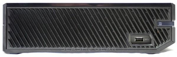 Up front you've got a 3.1-inch height that's half glossy plastic and half matte plastic, this first version of the console coming in all black. The half with the matte look to it has a disk drive with a single touch-sensitive button that allows you to load disks simply and unobtrusively. You'll have no danger of breaking off your disk tray because there isn't one – the Xbox One is slot-loaded.