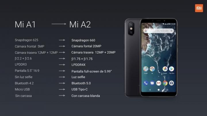 Unfortunate for those lovers of the headphone jack, this device drops the port. There's nothing like an upgrade that cuts options, right? Below you'll see a comparison between the Mi A1 and A2 – in Spanish, but you get the idea, right?