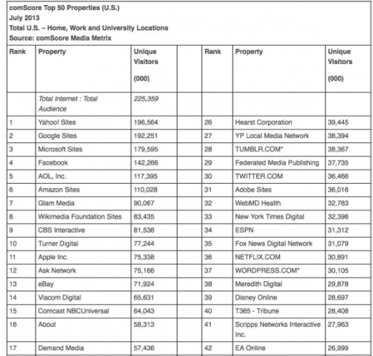 For the first time in over two years, Yahoo came in at number on on ComScore's list of Top 50 US Web Properties. The list, which was just released today, is a bit of a surprise, as Yahoo hasn't claimed the top position since May 2011. While initial speculation made it seem like the acquisition of Tumblr had something to do with this boost, that is not the case.